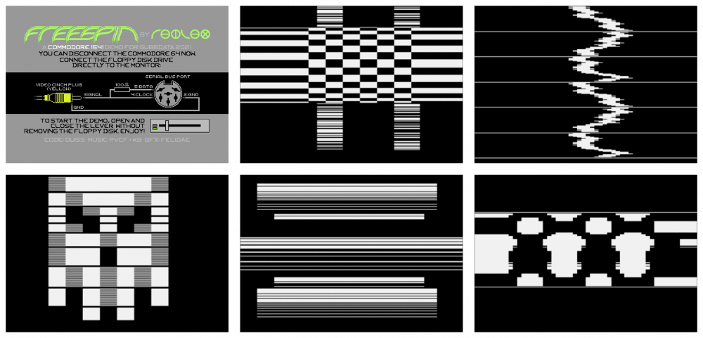 Freespin is a groundbreaking 2021 Reflex demo for the Commodore 1541 disk drive that generates video and audio directly from the drive itself, without needing a Commodore 64 computer to run it. Using a special cable, the 1541's 6502 CPU drives a monitor directly, creating a "demo without a C64".